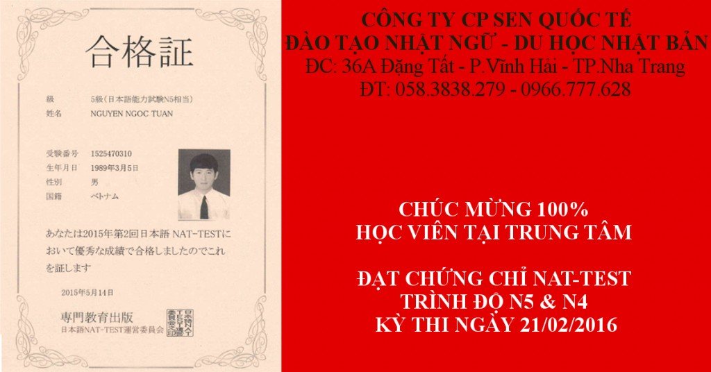 Chúc mừng tất cả các bạn tân du học sinh và học viên của công ty CP Sen Quốc Tế đã thi đậu kỳ thi Nat test tháng 2/2016 vừa qua với tỉ lệ 100% N5 và 87,5% N4.